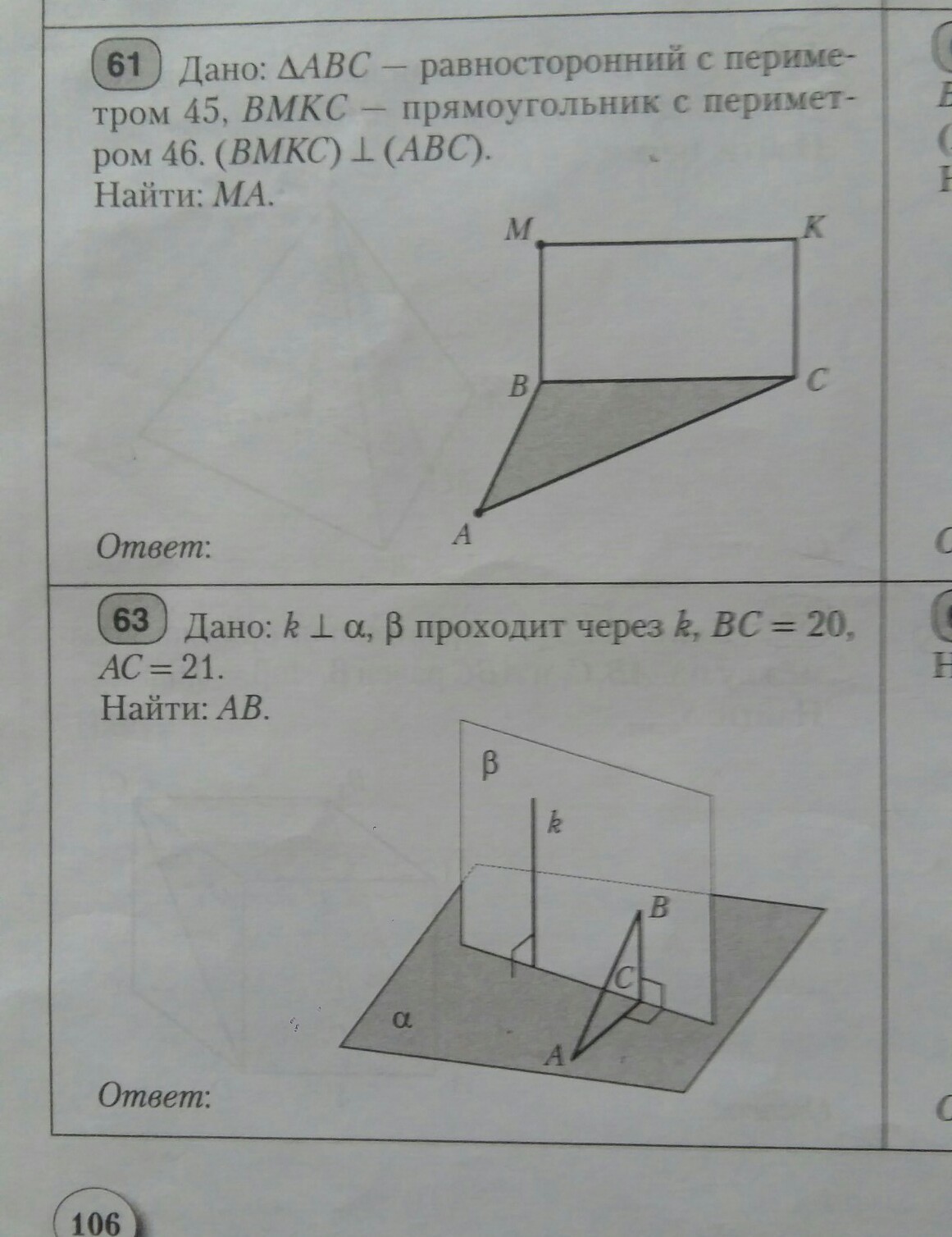 62. Плоскость β перпендикулярна плоскости α, так как прямая k, принадлежащая плоскости β, перпендикулярна плоскости α (признак перпендикулярности плоскостей).