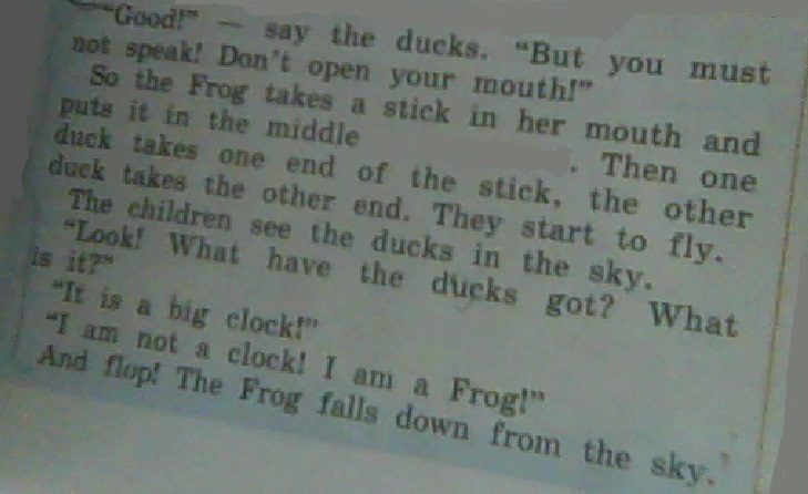 Хорошо! Сказали утки. Но тебе не обязательно говорить! Держи рот на замке! Так Лягушка берет палку в рот и кладет ее посередине. Затем одна утка принимает один конец палки, другие утки занимает другой конец. Они начинают летать. Дети видят в небе уток. Смотри! Что есть у уток? Что это такое? Эти большие часы! У меня нет на это времени! Я Лягушка! И флоп! Лягушка падает с неба.