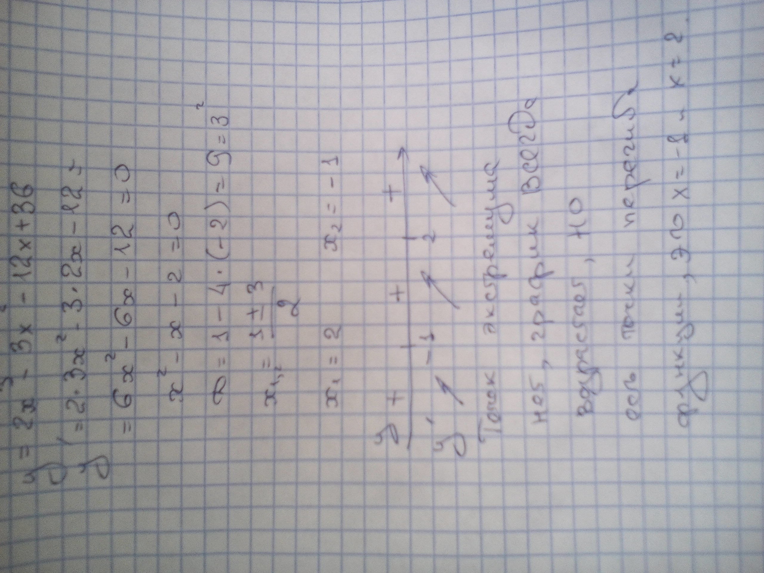 знайти проміжки зростання і спадання та естремуму функції y=2x³-3x²-12x+36