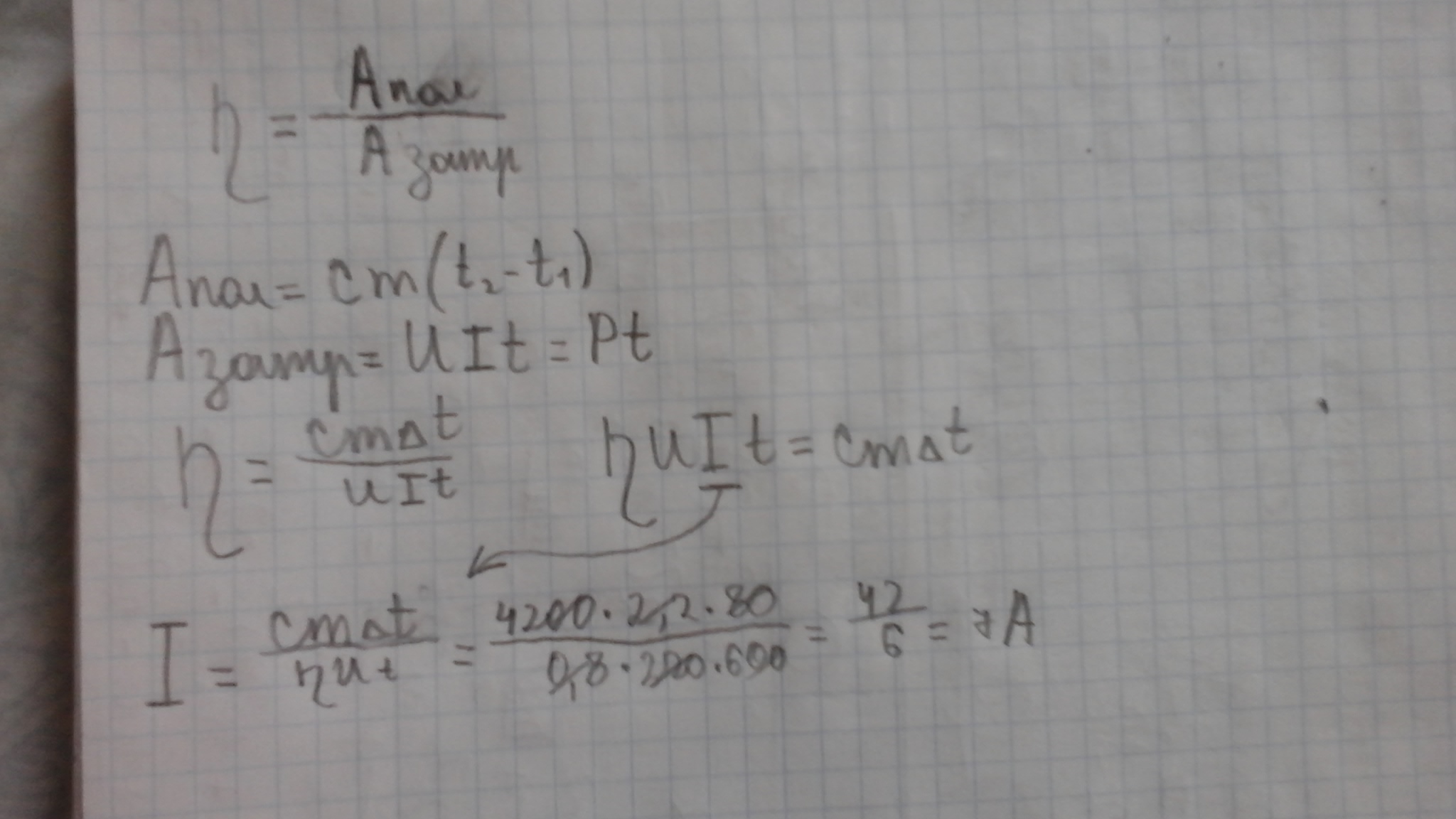 Чайник включен в цепь напряжением 220В. Чему равна сила тока в нагревателе чайника, если за 10 минут в этом чайнике нагревается 2,2 кг воды от 20° до кипения? КПД чайника 80%