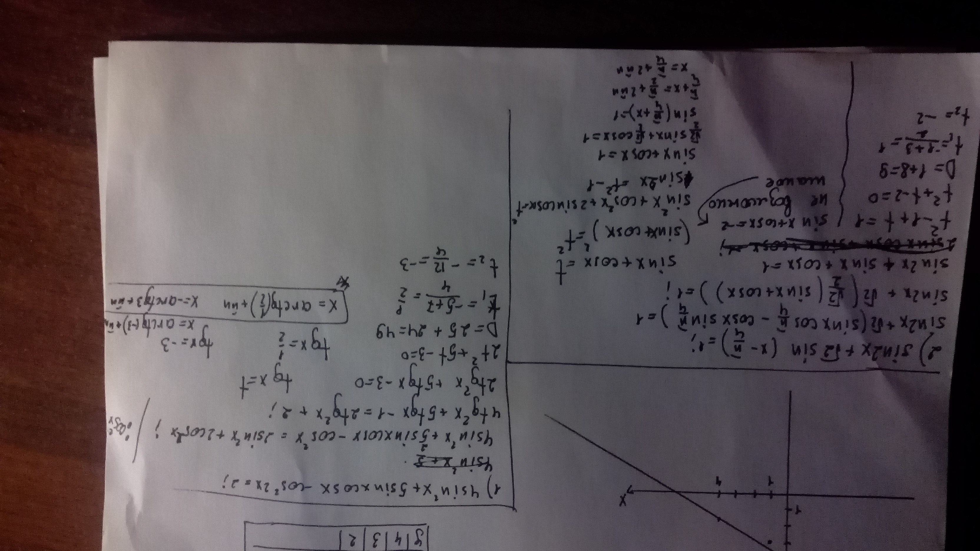Помогите с тригонометрией. 1) 4sin2^x+5sinxcosx-cos^2x=2. 2) sin2x+корень из 2 sin(x-pi/4)=1. 3) sinx-sin3x=4sin^2xcosx