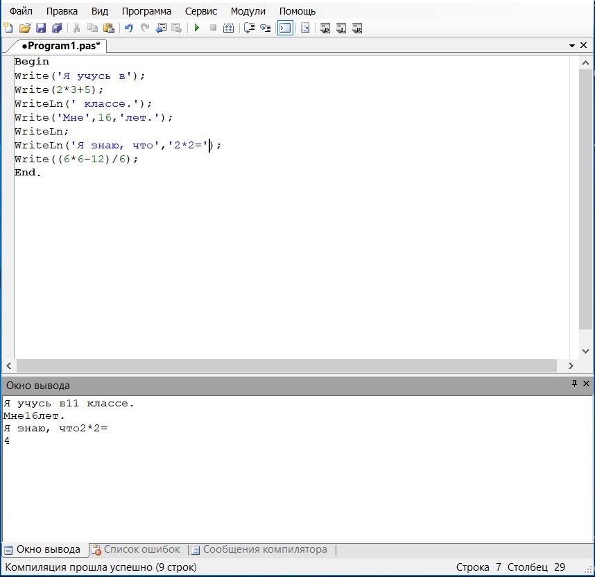 WriteLn(‘Я знаю, что’,‘2*2=’);