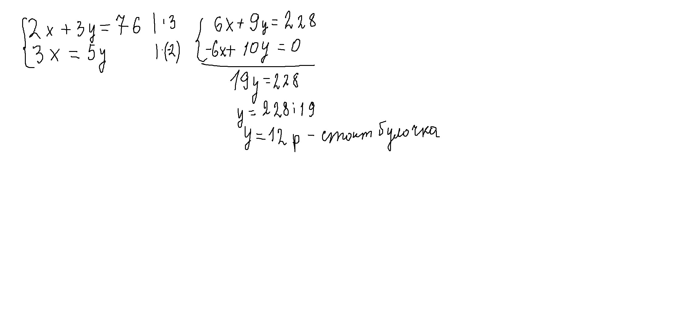 за 2 бутылки лимонада и 3 булочки заплатили 76 рублей.3 бутылки лимонада стоят столько же,сколько стоят пять булочек,сколько стоит булочка?