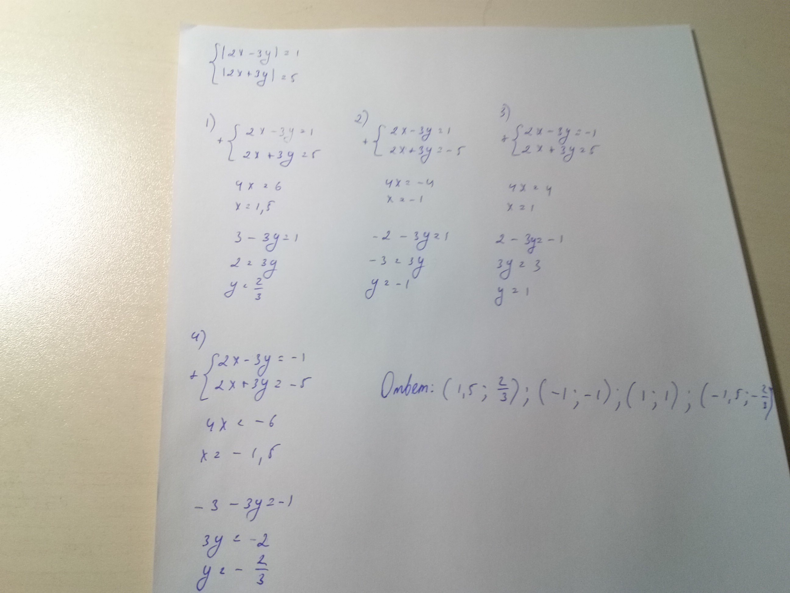 Решаем 4 возможных варианта (открываем модули со знаками: 1)++, 2)+-, 3)-+, 4)-- )