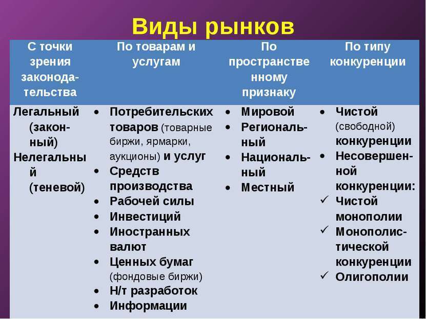 Основные признаки рынка: нерегулируемая цена, нерегулируемое предложение, нерегулируемый спрос.