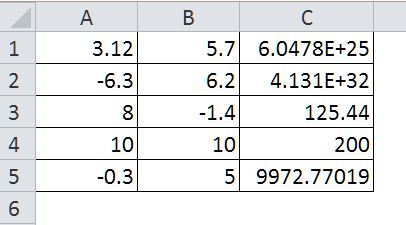 x - по колонке A1:A5, y - по колонке B1:B5, результат в C1:C5