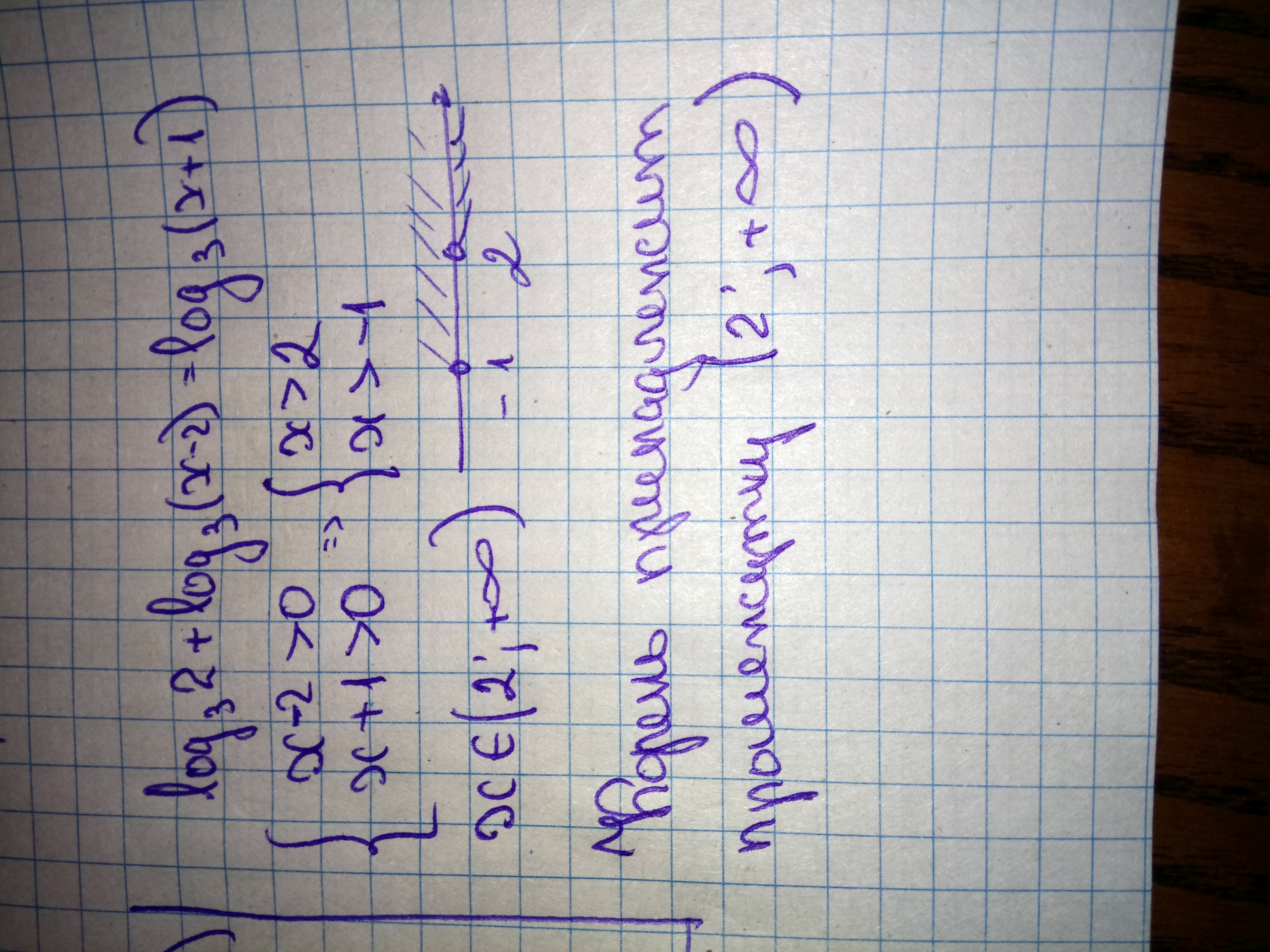 Указать промежуток, которому принадлежит корень уравнения log3 (2) + log3 (x - 2) =log3 (x +1)