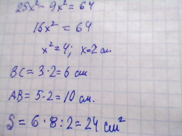 Знайдіть площу прямокутного трикутника, якщо бісектриса його кута ділить протилежний катет на відрізки завдовжки 3 см і 5 см.