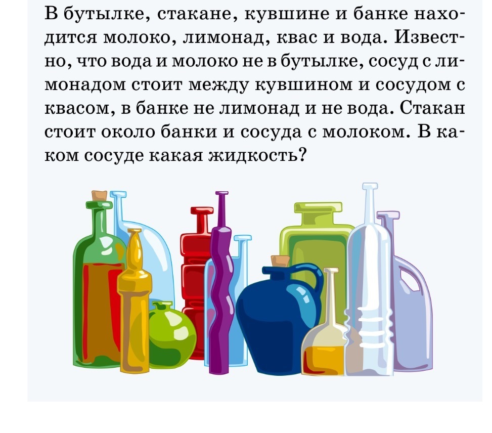 В условии сказано, что в Бутылке не может быть Молока и Воды, так же в условии написано, что Лимонад и Квас стоит рядом с Кувшином, значит в Кувшине их не может быть. В условии написано так же, что в Банке не может быть Кваса и Лимонада,так же написано, что в Банке не Лимонад и не Вода, так же сосуд с Молоком стоит около Стакана и Банки, значит Молока там не может быть. Значит в Кувшине Молоко, для Воды остаётся только Стакан, для Лимонада только Бутылка осталась, а для Кваса Банка