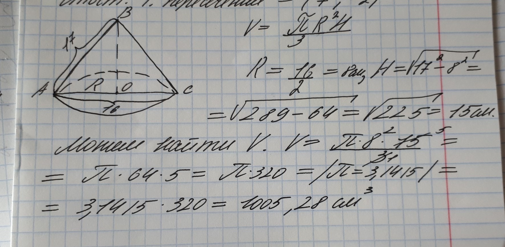 V = πr²h/3 = 3,14*64*15/3 = 320π ≈ 1005 (см³)