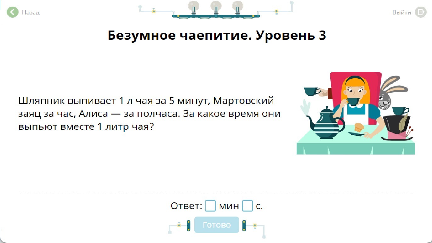 Так эффективность шляпника = 1/5(Эффективность в количестве чая за минуту) эффективность зайца 1/60, а Алисы 1/30 следовательно их общая эффективность равна 1/5+1/30+1/60=15/60=1/4 следовательно ответ 4 минуты