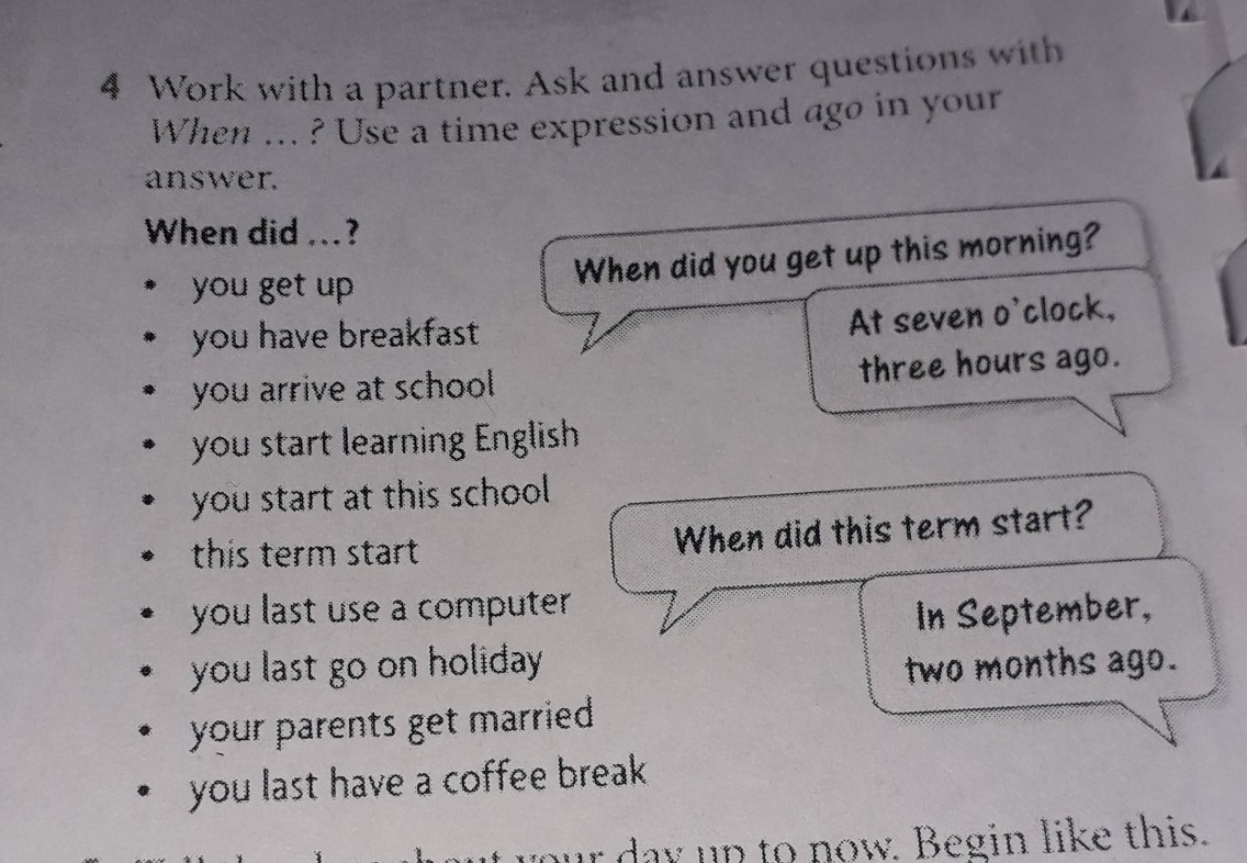 1 when did you get up this morning? At six o'clock, an hour ago.