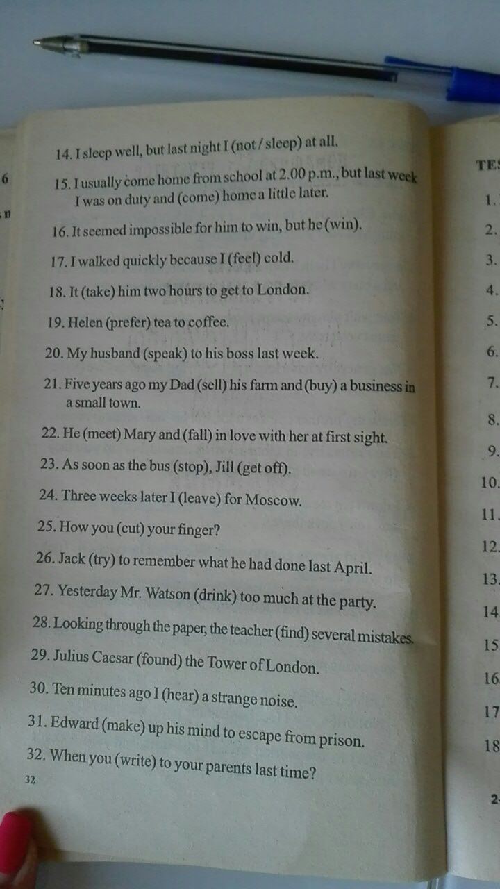 19. Helen prefers tea to coffee.21. Five years ago my Dad sold his farm and bought a business in a small town.23. As soon as the bus stopped, Jill got off.27.Yesterday Mr. Watson drank too much water at the party.32. When did you write to your parents last time?
