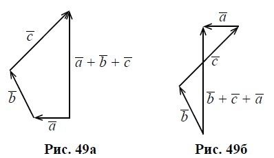 На рис. 49 а – б показано сложение трёх векторов a, b и c по правилу многоугольника для двух разных последовательностей сложения: a +b+c и b+c+a.