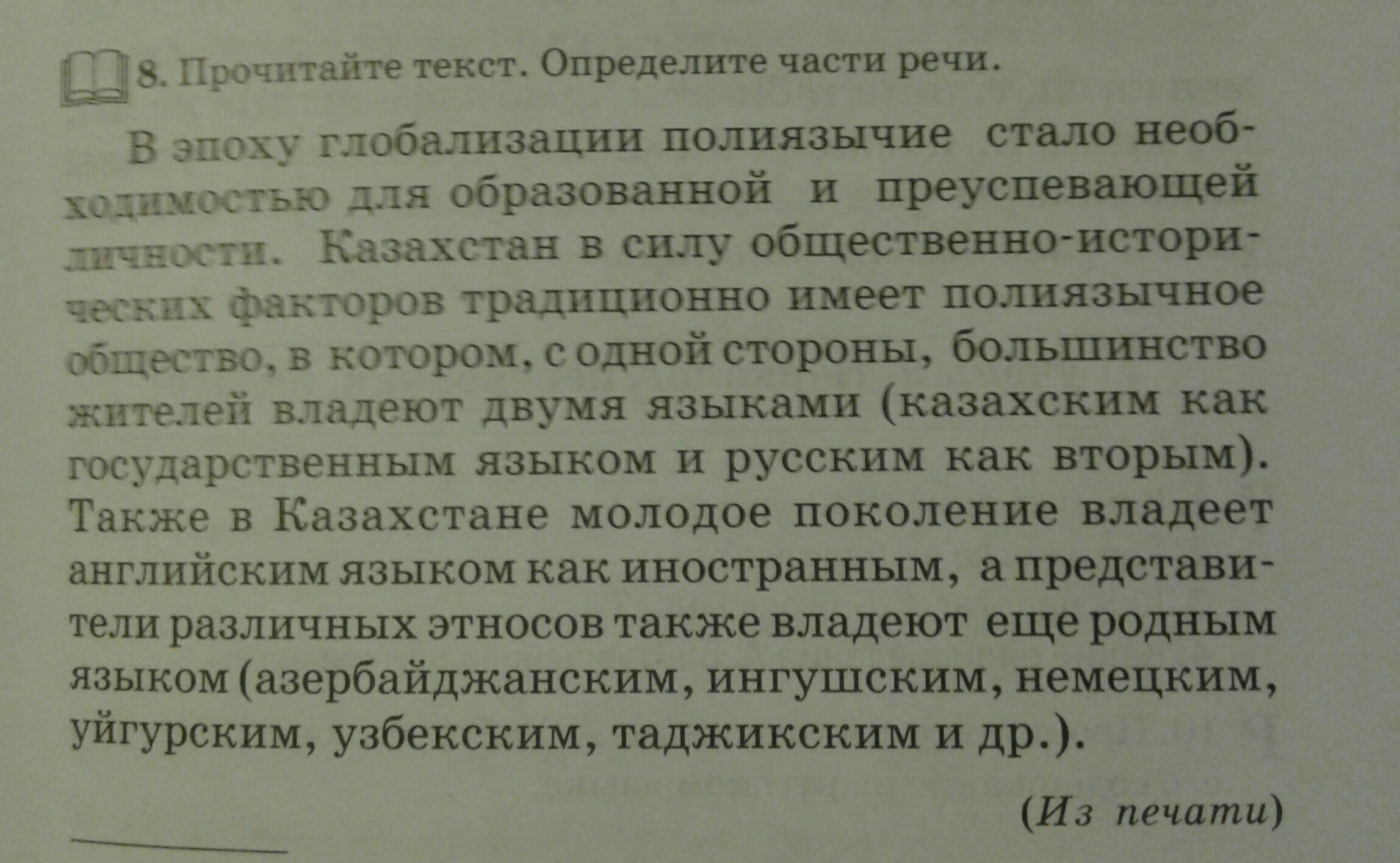 в эпоху - сущ, глобализации - сущ., полиязычие-сущ., стало необходимостью - глагол (или причастие), образованной и преуспевающей - прил-е, личности - сущ,