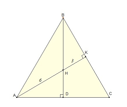 в равнобедренном треугольнике авс (ав=вс) точка h ортоцентр. Высота АК=9 см, а отрезок АН=6 см. Найдите площадь треугольника авс
