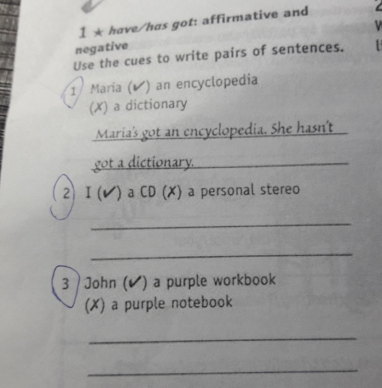 3. John's got a purple workbook. He hasn't got a purple notebook.