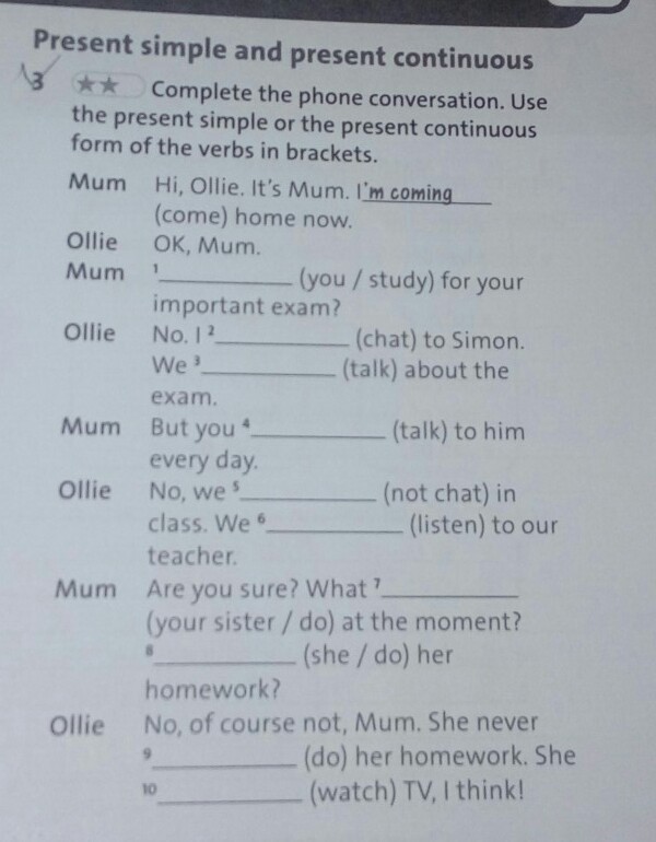 No.I am chatting to Simon.We are talking about the exam.But you are talk to him every day.No, we are not chatting in class.We are listening to our teacher.What is your sister doing at the moment?She is doing her homework?No, of course not, Mum. She never doing her homework. She is watching TV, I think!