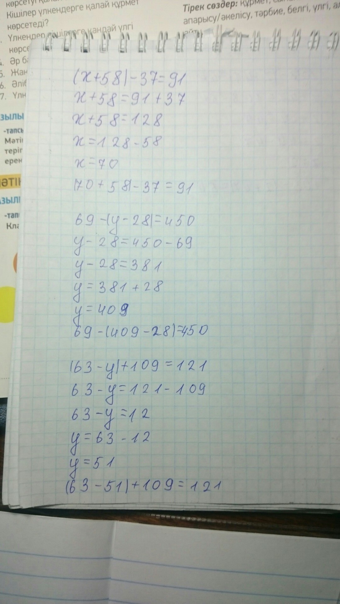 1)Х=58+37 Х=95 2)х=69+28 Х=87 3)х=109-63 Х=46 4)103+47 Х=150