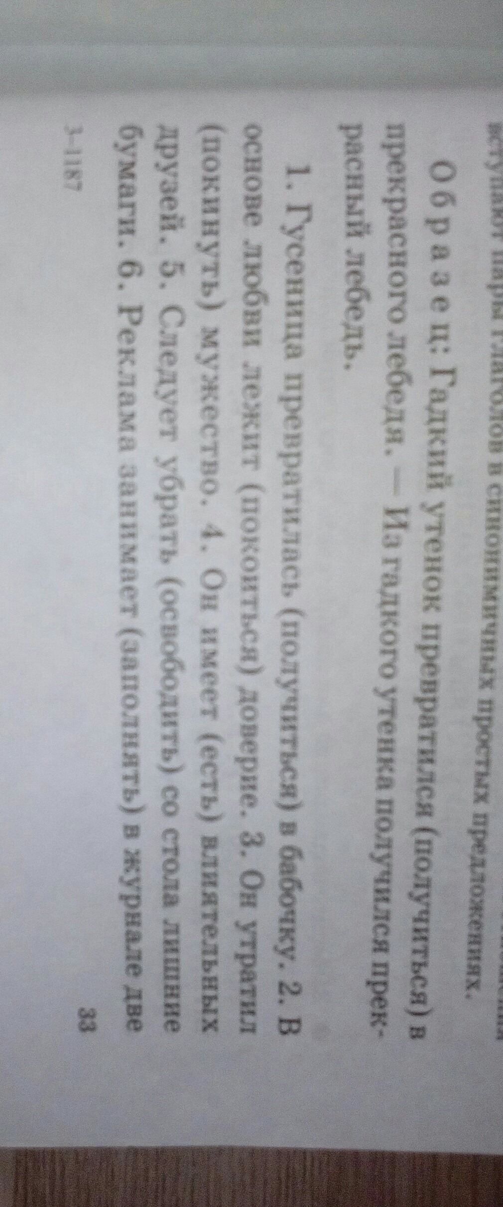 помогите срочно . Преобразуйте данные простые предложения , заменя одни глаголы дригими , данными в скобках. вот ппедлодения и еще на фотке.Реклама занимет ( заполнять) в журнале две страницы.Он сообщил ( узнать) мне последние новости. слово может приобреси ( появиться) новое значение. упаковочная машина в считанные минуты обмотала ( обернуть) багаж несколькими слоями пленки.