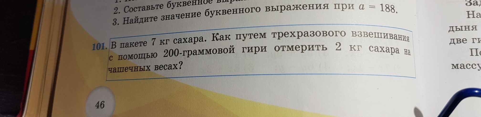 в пакете 7 кг сахара. как путем трехразового взвешивания с помощью 200- грамовой гири отмерить 2 кг сахара на чашечных весах?