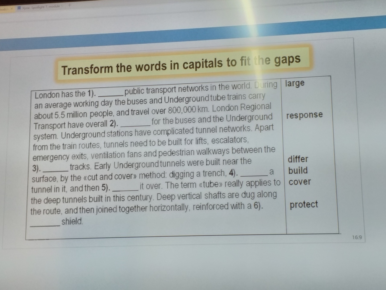 Преобразуйте слова в столицах, чтобы они соответствовали ему. В Лондоне есть 1) общественные сети общественного транспорта в мире. В среднем за день рабочий день автобусов и поездов Undergroundtube несут около 5 5 человек и путешествуют более чем на 800 000 км. Региональный транспорт Лондона в целом 2). система Подземные станции имеют сложные туннельные сети. Помимо маршрутов поездов, необходимо построить воронки для лифтов, эскалаторов для букетов и аварийных аварийных станций под землей, вентиляторов и пешеходных дорожек между 3) дорогами. Ранние подземные туннели были построены вблизи поверхности метод ecut и охватывает: dgging траншеи, 4) туннель в нем, а затем 5) он над термином Этюды действительно применимы к глубоким туннелям, построенным в этом столетии. Глубокие вертикальные валы вырыты вдоль различной покровной дорожки, а затем объединились в кругу, с защитой 6