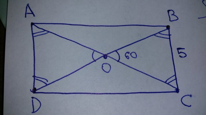 меньшая сторона прямоугольника равна 5см, диагонали пересекаются под углом 60°. найдите диагонали прямоугольника