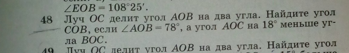 Дано:угол АОВ,АОВ=78*,угол АОС меньше угла ВОС на 18*