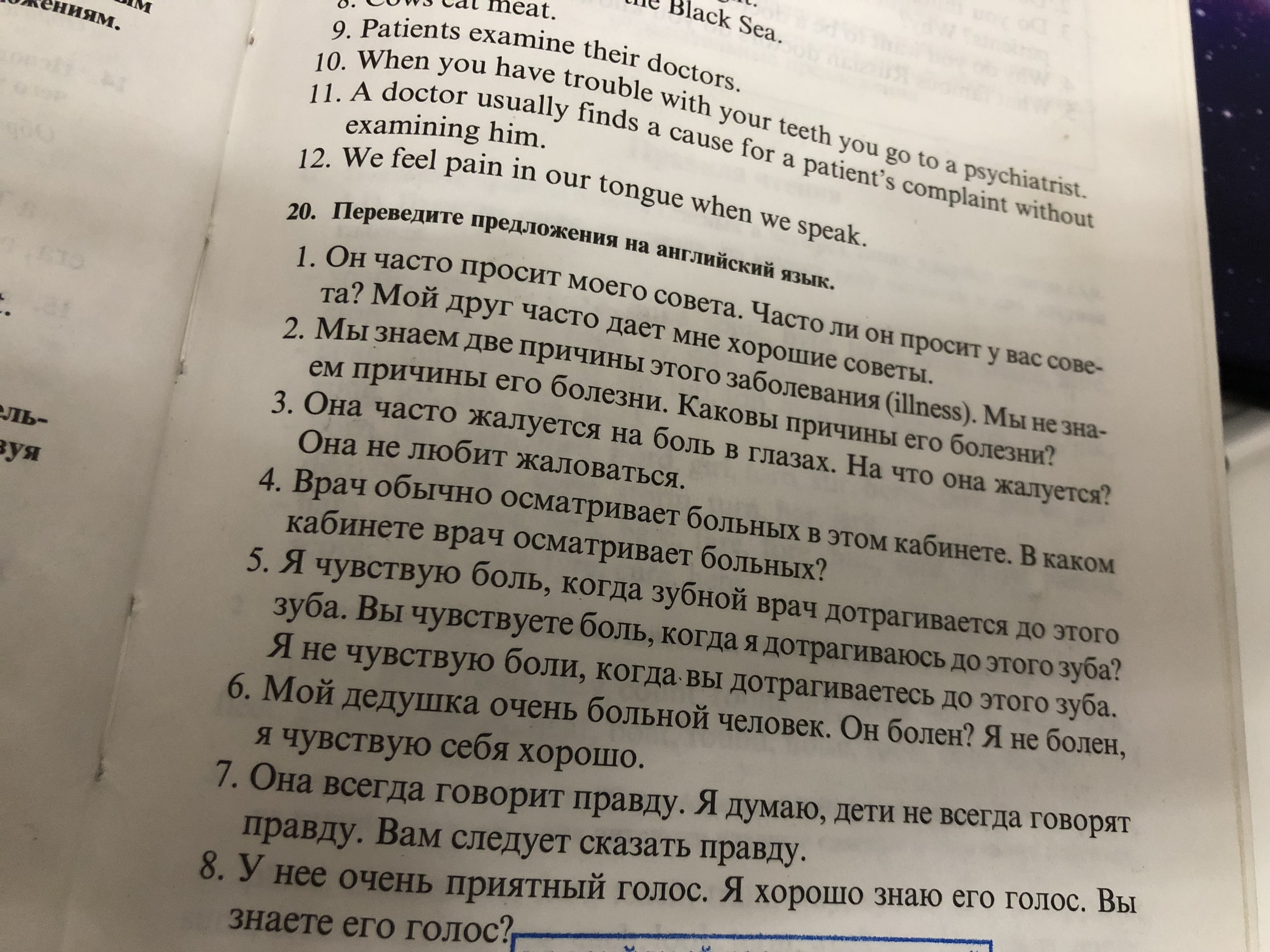 He often asks for my advice. Does he often ask you for advice? My friend often gives me good advice. know the two causes of this disease. We do not know. We often complain of pain in the eyes. 11 The doctor usually examines the sick in this office. In what kind of pain do I feel when the dentist dies aostoro? She does not like to complain. Does the doctor examine the patients? tooth. Do you feel pain when I gnawed at the tooth? the ranks of his illness. What are the causes of his illness? and that she complains? I do not feel pain when you dotra, you go to noroyoa. My grandfather is a very sick man. He is sick ? I'm not sick at always telling the truth. I think that children do not always tell the truth. You should tell the truth. I feel good . She has a very nice voice. I know ero roloe well. You know his voice