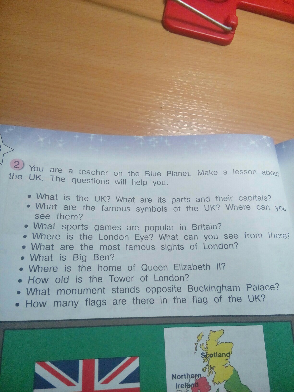 Вы учитель на Синей Планете. Сделайте урок в Великобритании. Вопросы помогут вам. Что такое Великобритания? Каковы его части и их столицы? Каковы знаменитые символы Великобритании? Где вы можете Какие спортивные игры популярны в Великобритании? Какие самые знаменитые достопримечательности Лондона? Где дом королевы Елизаветы 11? увидеть их? Где Лондонский глаз? Что вы можете видеть оттуда? Что такое Биг Бен? Сколько лет Лондону? Какой памятник стоит напротив Букингемского дворца? Сколько флагов существует в флагах Великобритании?