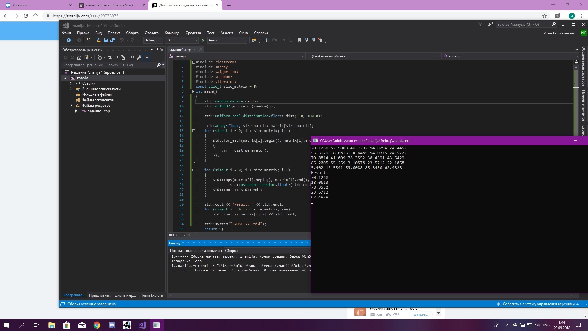 Допоможіть будь ласка скласти програму у С++:Дано квадратну матрицю порядку 5. Заповнити масив дійсними числами при його ініціалізації. Вивести на екран елементи головної діагоналі в рядок.
