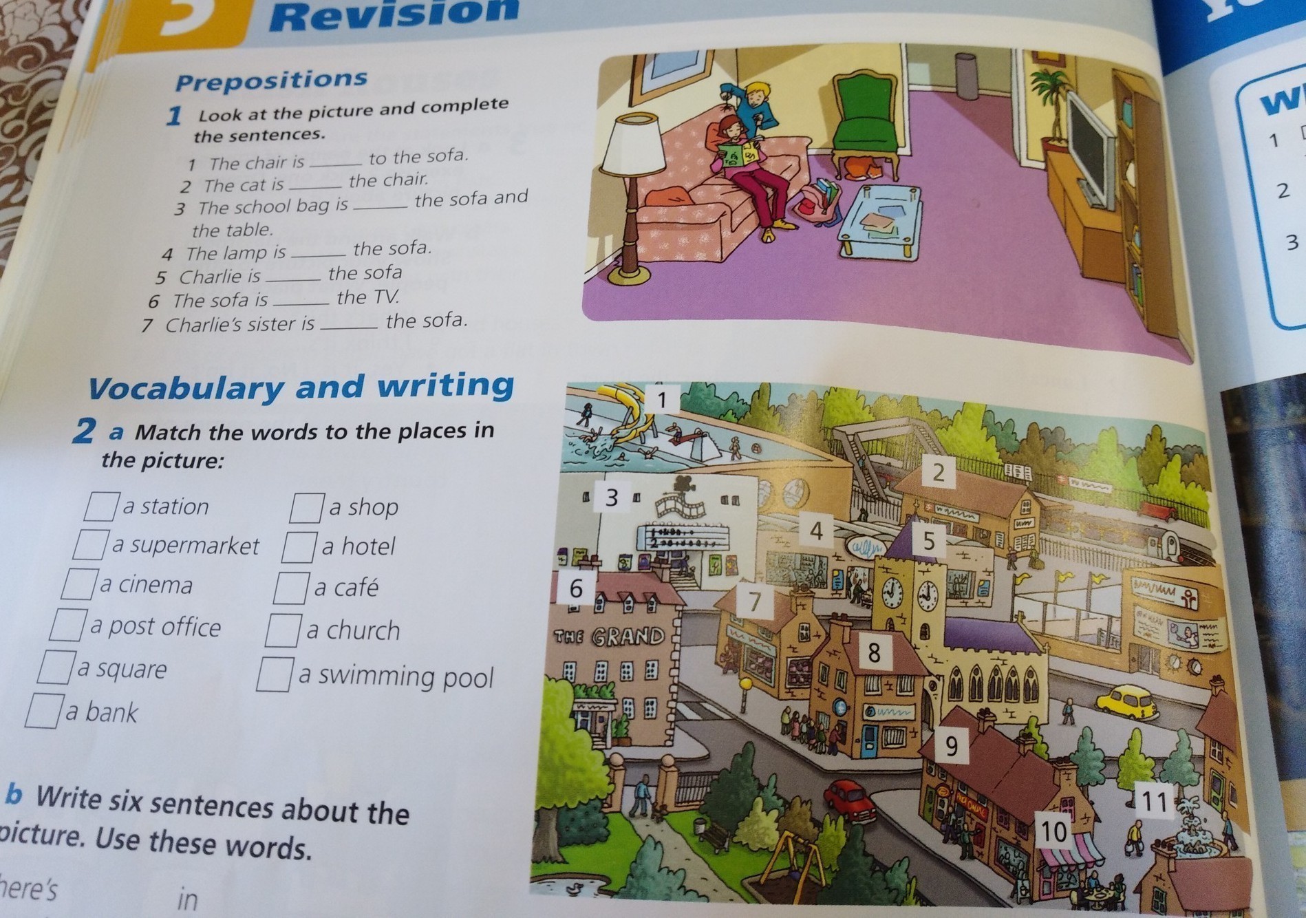 Помогите пожалуйста с заданием 2а. Здесь знание английского даже не обязательны. Просто на картинке не очень понятно где что находится. Я сделала всё, кроме 7;8;9, и остались только shop; bank; post office. Нужно распределить. Кто как думает?..
