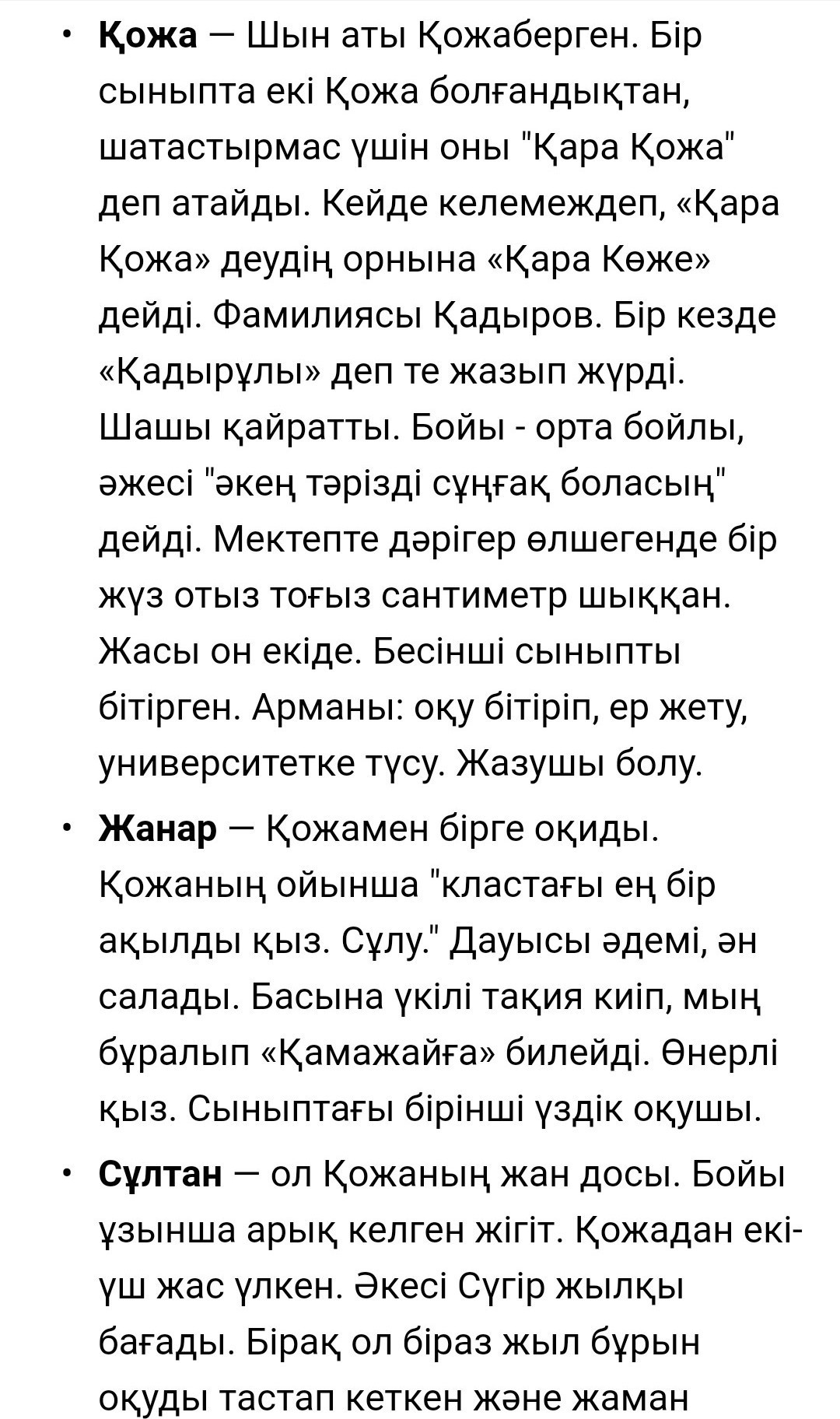 Написать описание, мнение про Кожу, Султан и Жанар на казахском и перевод