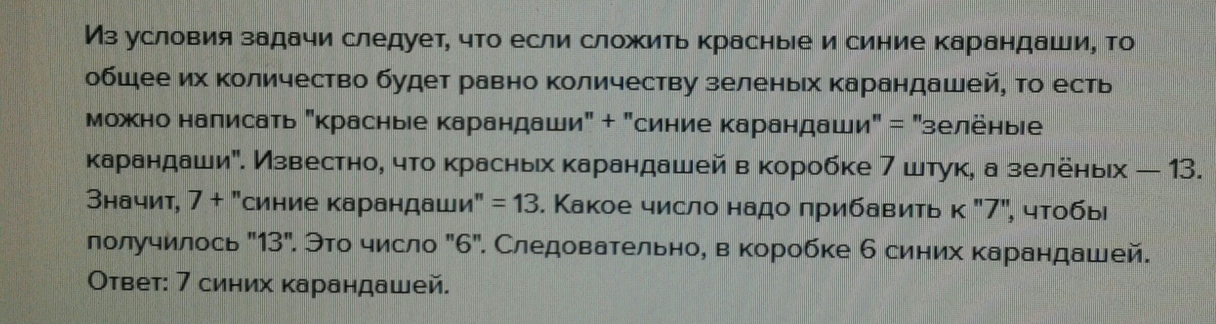 В коробке красных и синих карандашей вместо столько,сколько зелёных.Красных карандашей 7 зелёных 13.Сколько синих карандашей в коробке?