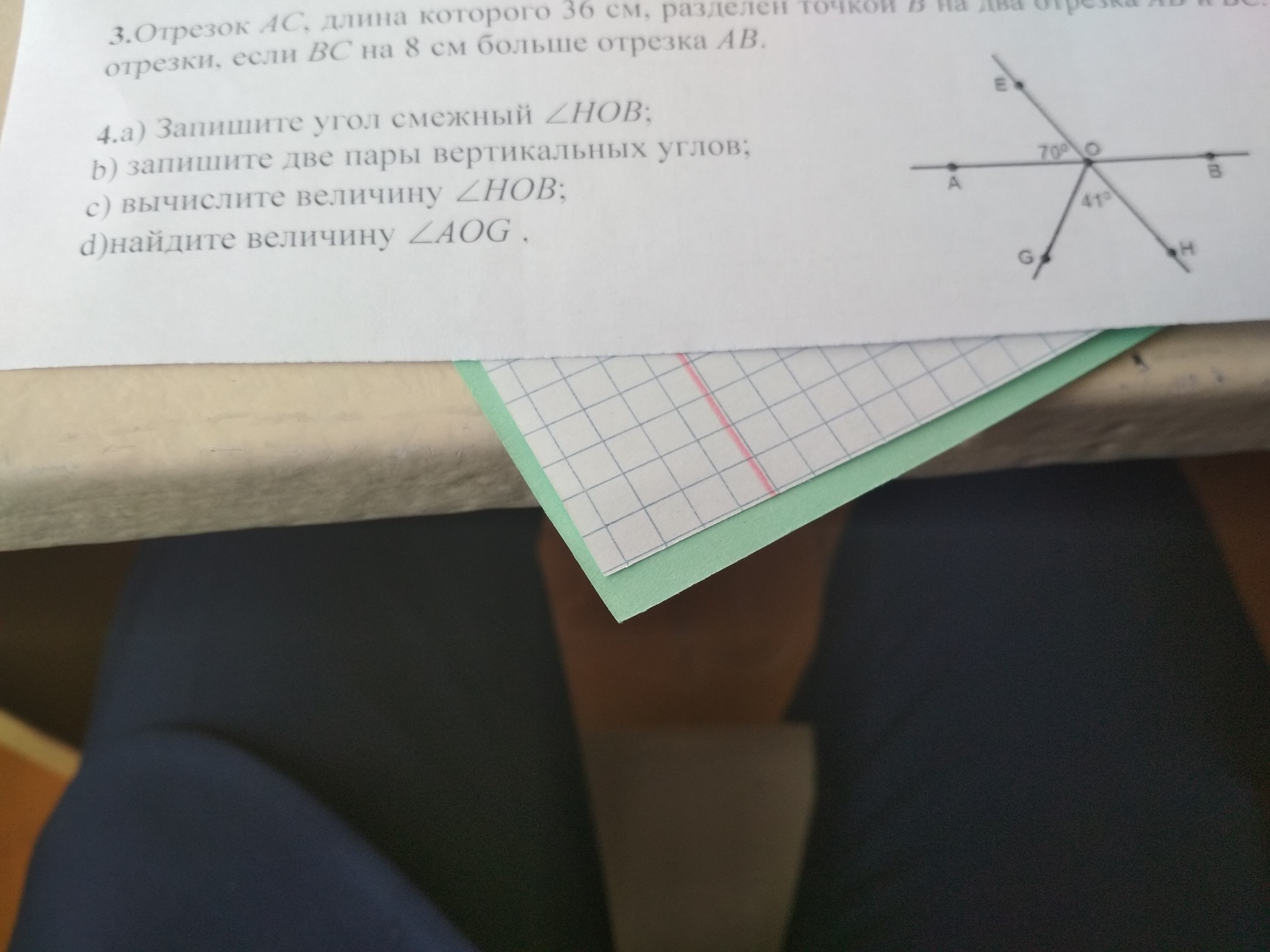 d) Сумма смежных углов равна 180°, поэтому AOG=180°–(41°+70°)=69°.