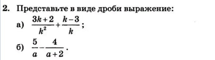 а). 3k+2+k^2-3k/k^2=(k^2+2)/k^2; б). 5a+10-4a/a*(a+2)=(a+10)/a*(a+2). ^- это степень. это и есть решение. а). наименьший общий знаменатель k^2. дополнительные множители: для первой дроби: 1, для второй дроби k. 2). наименьший общий знаменатель: а*(а+2). дополнительные множители: для первой дроби: (а+2), для второй дроби: а.