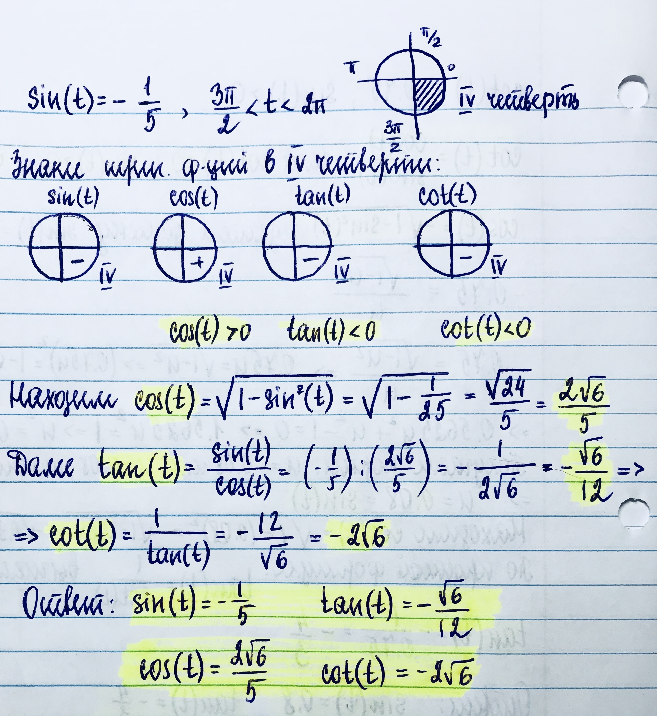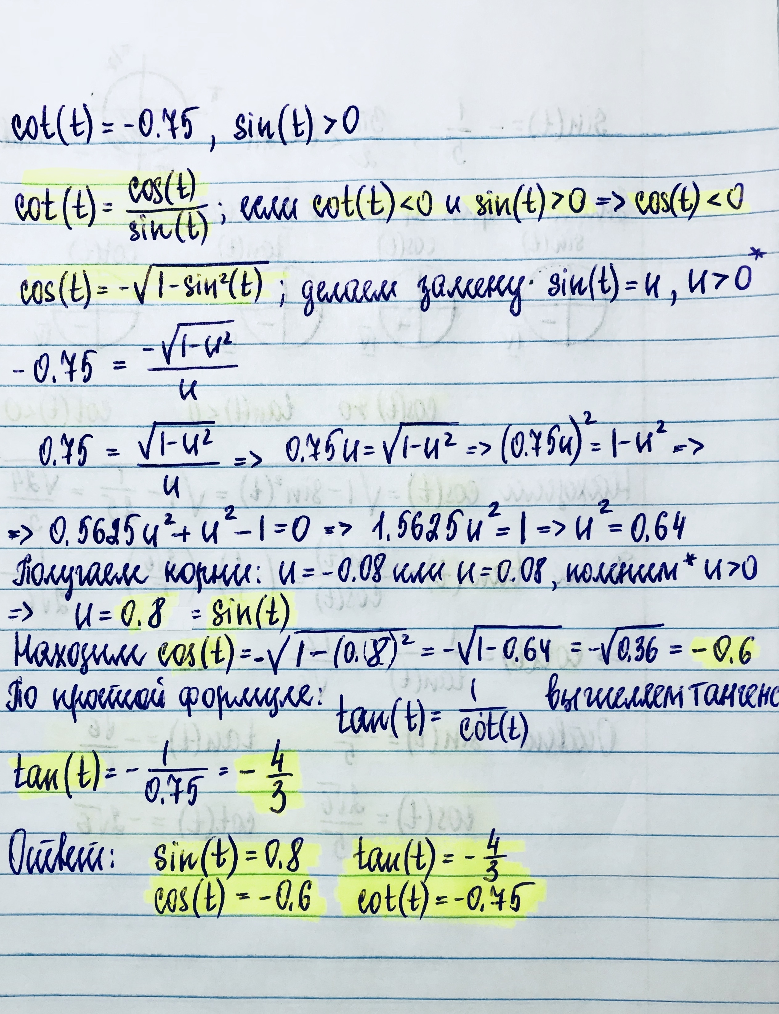 зная значение одной из тригонометрических функций найдите значение остальных ctgt=-0,75; sint>0 ; sint=-1 дробь корень 5; 3П/2 < t < 2П