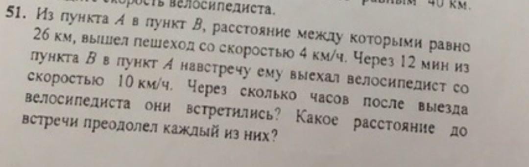 Ответ: Они встретелись через 1.8ч после после выезда велосипедиста. Растояние до встречи пешеход прошёл 8 км, велосепидист - 18 км