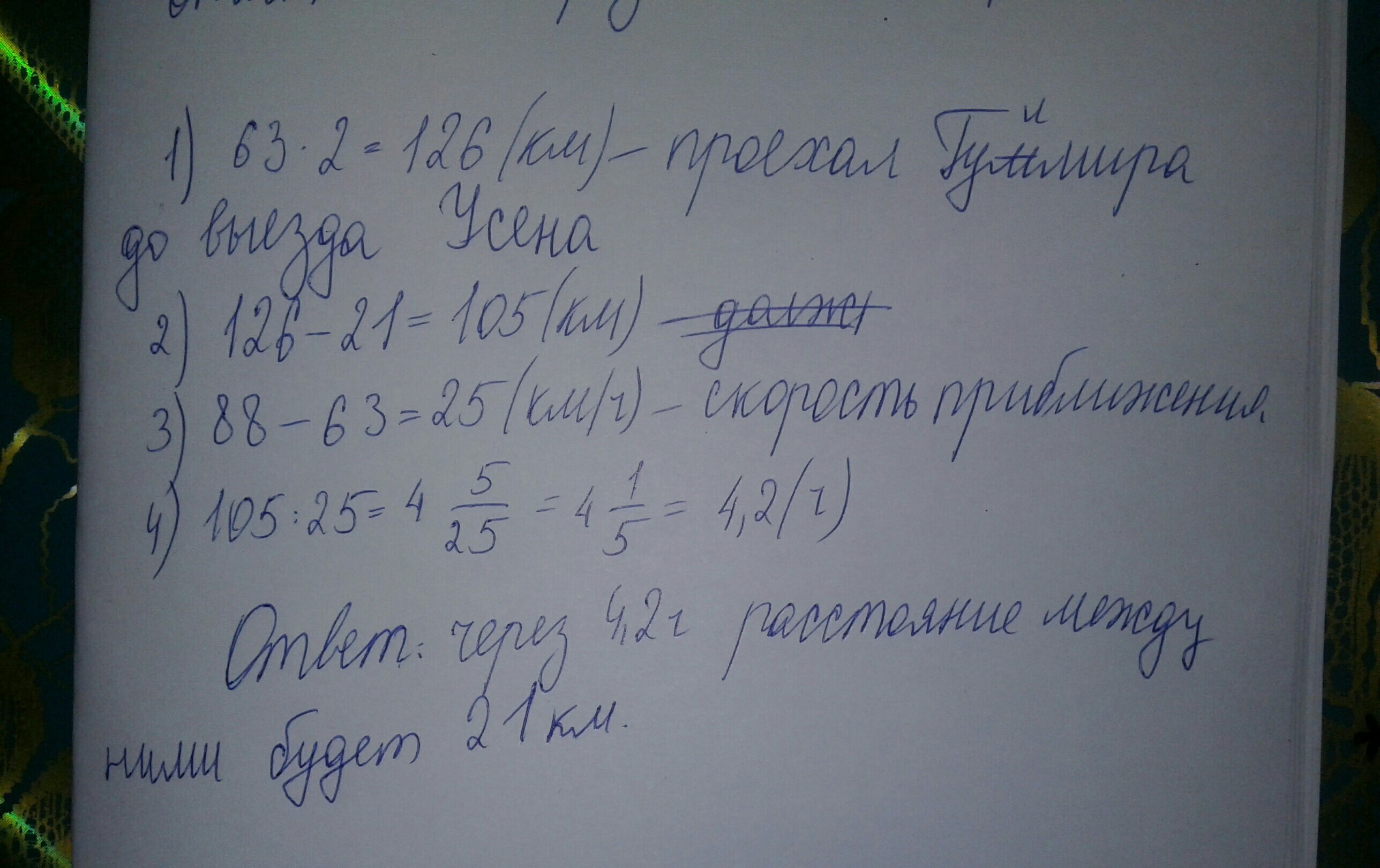 Гулмира едет со скоростью 63 км/час через 120 мин следом за ней со скоростью 88 км/час выехал Усен. Через сколько часов расстояние между ними будет равно 21 км/час?