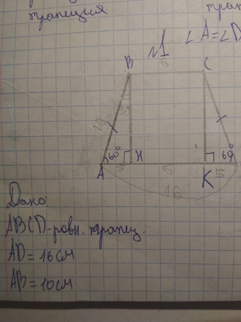 Рассмотрим треугольник ABH. Так как ABH равна 30градусов, следует , что AH равна половине AB=10:2=5. Треугольник ABH=KCD. Следовательно, KD то равно 5.отсюда полечатся, что ВС= 16-10=6.