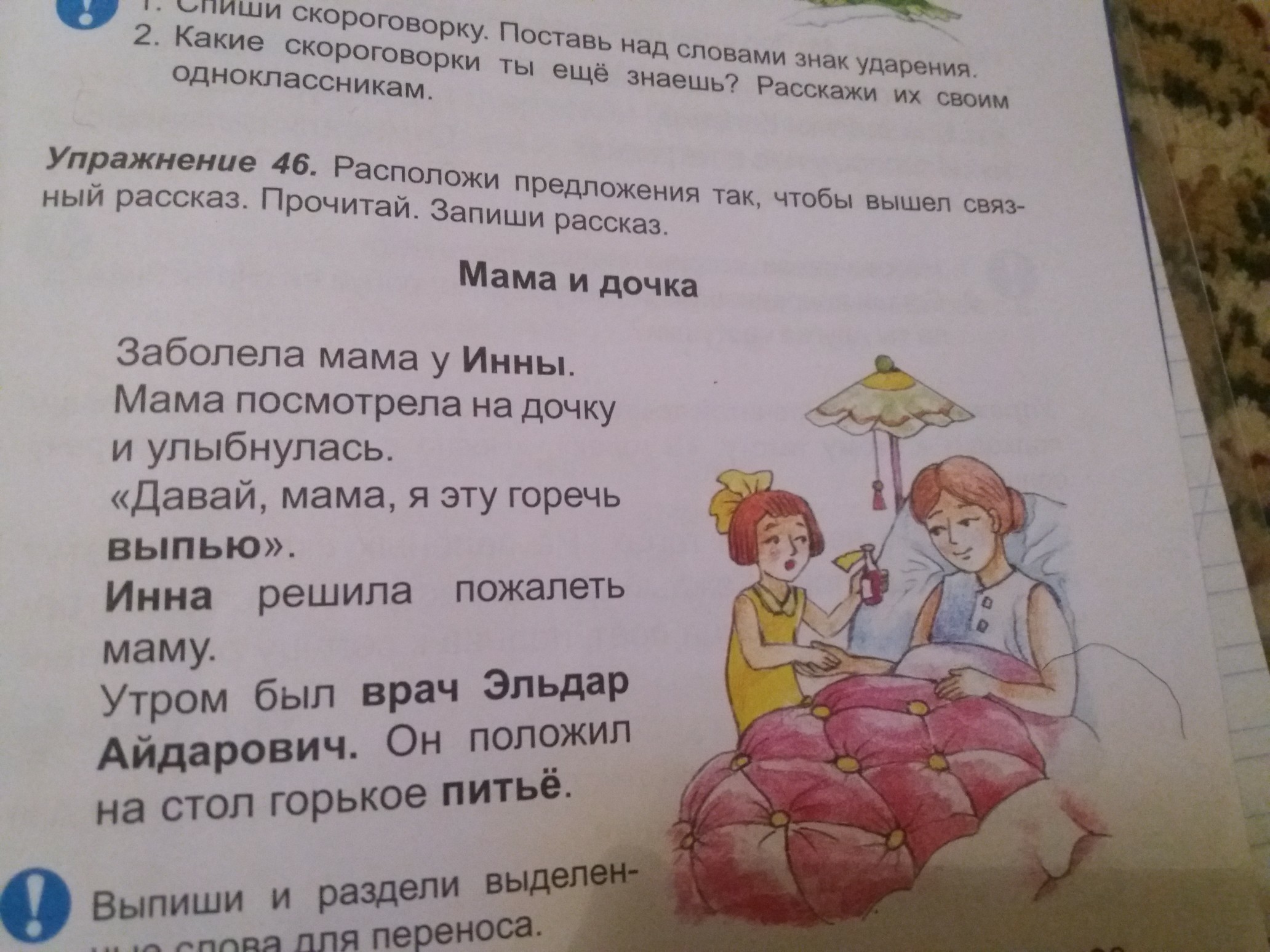 Заболела мама у Инны. Утром был врач Эльдар Айдарович . Он положил на стол горькое питье . Инна решила пожалеть маму. Давай мам я эту горечь выпью . Мама посмотрела на дочку и улыбнулась.