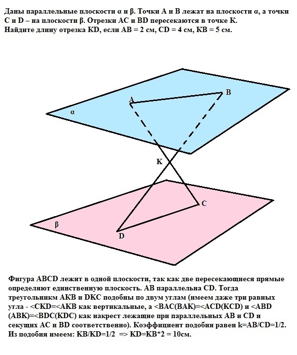 Дано параллельные плоскости α и β. Точки А и В лежат на плоскости α, а точки С и D – на плоскости β. Отрезки АС и ВD пересекаются в точке К. Найдите длину отрезка КD, если АВ = 2 см, CD = 4 см, КВ = 5 см.