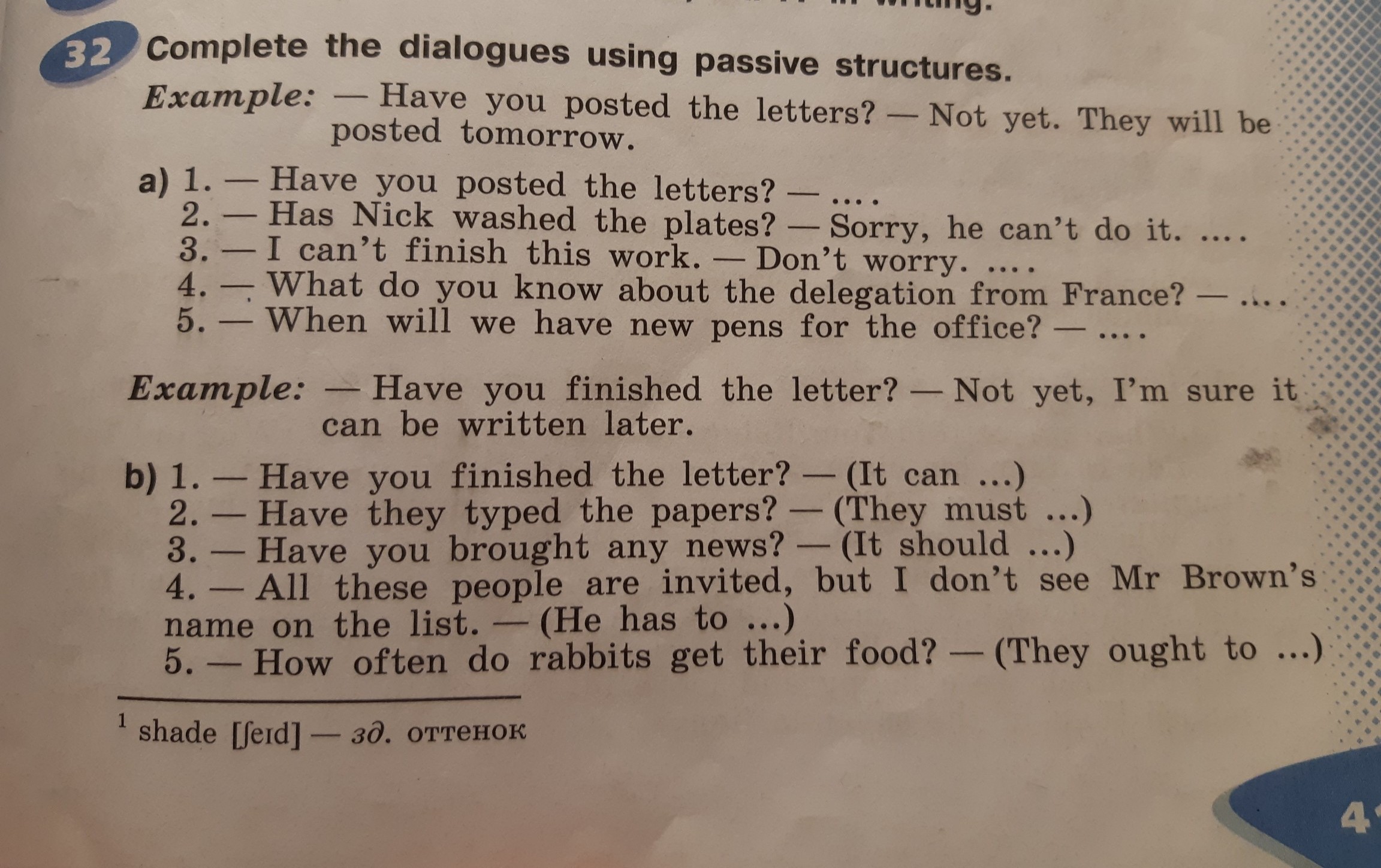 Завершите диалоги, используя пассивные структуры.