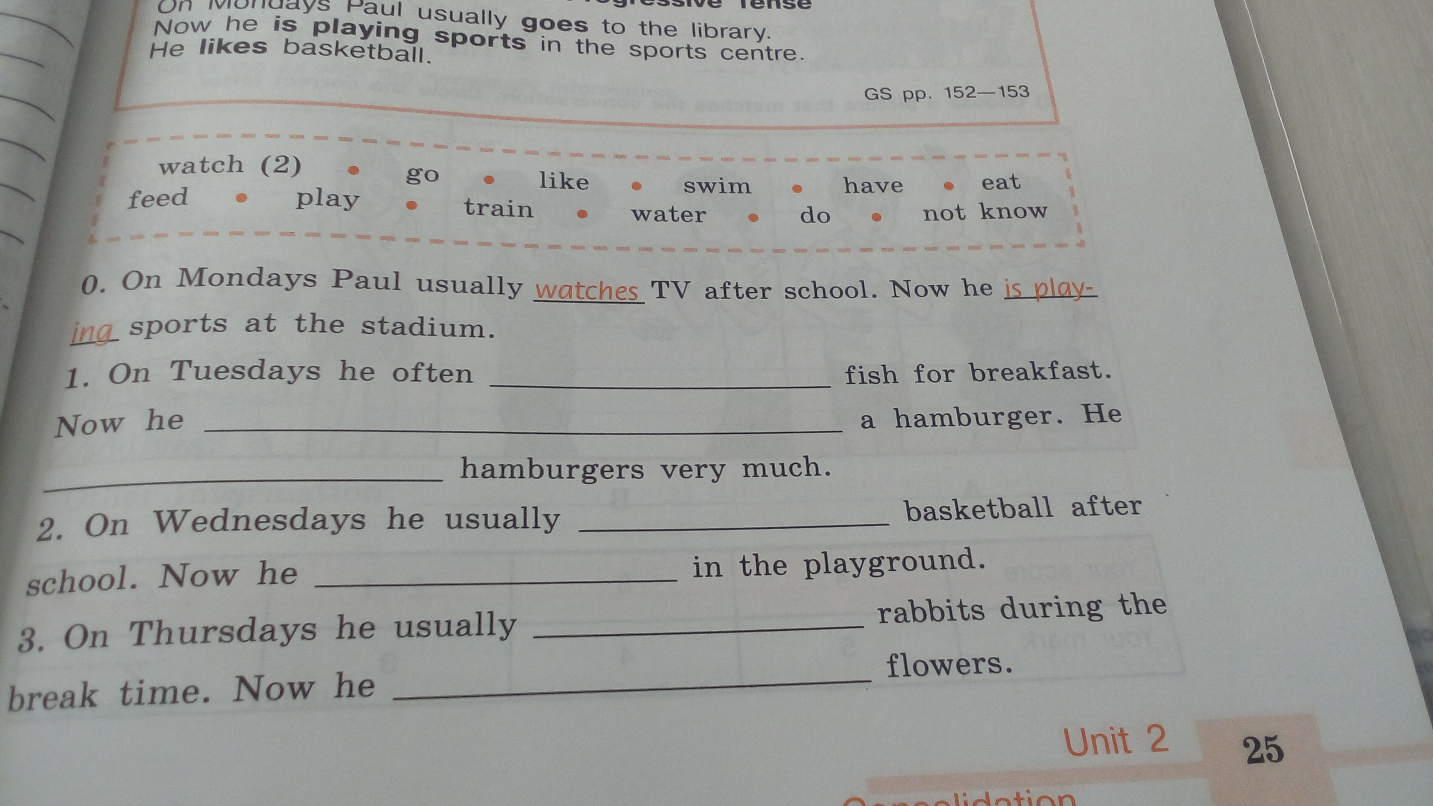 0) По понедельникам Пол обычно смотреть телевизор после школы. Сейчас он занимается спортом на стадионе.
