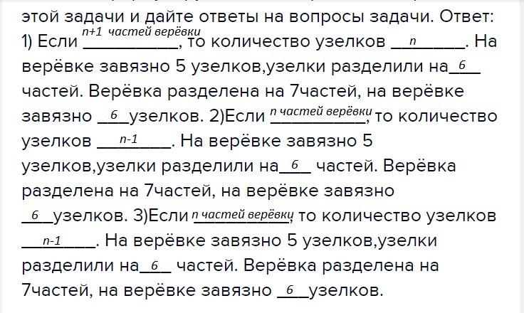 На верёвке завязали пять узлов.На сколько частей эти узелки разделили верёвку? Сколько надо завязать узелков, чтобы разделить верёвку на семь частей? Сформулируйте общие правила для решения этой задачи и дайте ответы на вопросы задачи. Ответ: 1) Если _________, то количество узелков _______. На верёвке завязно 5 узелков,узелки разделили на___ частей. Верёвка разделена на 7частей, на верёвке завязно ___узелков. 2)Если _________, то количество узелков _______. На верёвке завязно 5 узелков,узелки разделили на___ частей. Верёвка разделена на 7частей, на верёвке завязно ___узелков. 3)Если _________, то количество узелков _______. На верёвке завязно 5 узелков,узелки разделили на___ частей. Верёвка разделена на 7частей, на верёвке завязно ___узелков.