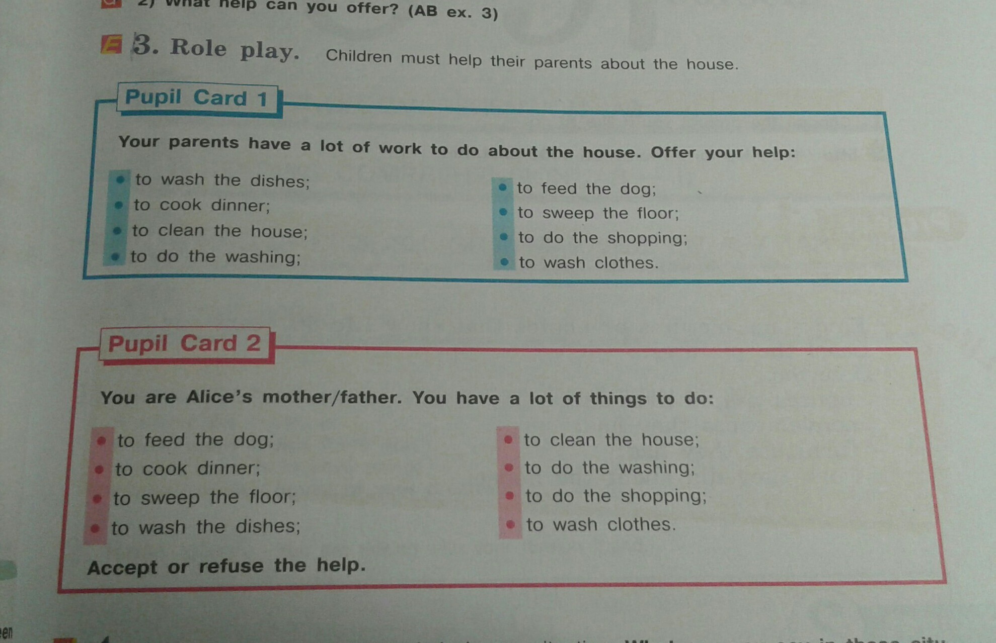 В первой колонке, синего цвета ты должна подчеркнуть с чем ты помогаешь своим родителям