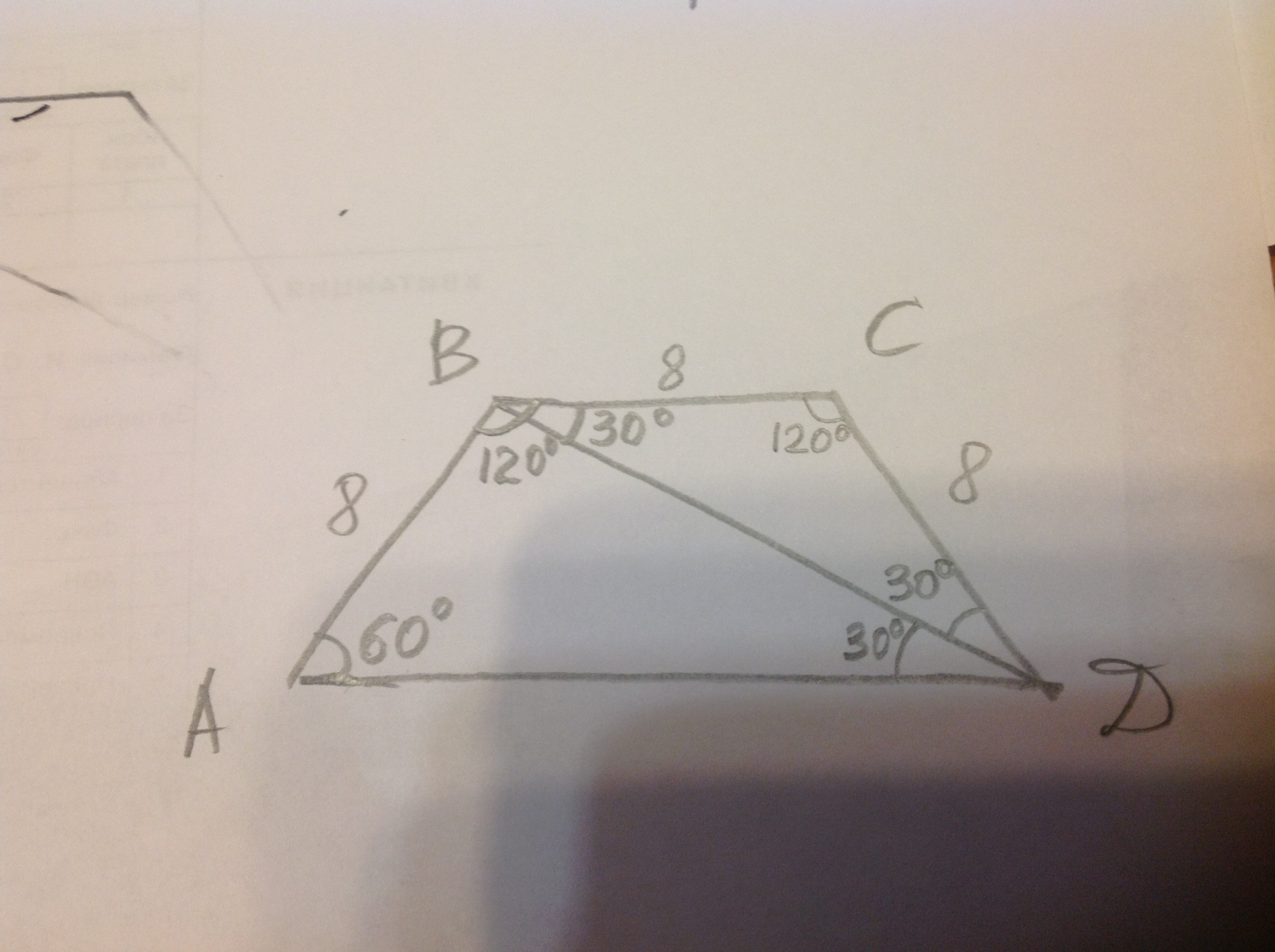 Трапеция равнобокая, значит, углы при основаниях равны. Посему сверху два по 120 град, снизу два по 60 град. Тогда ∠BDC=30°. Тогда ∠DBC=30°. ΔBCD равноведренный, ВС=CD=8. ΔABD прямоугольный, поэтому AD=8/sin30°=16