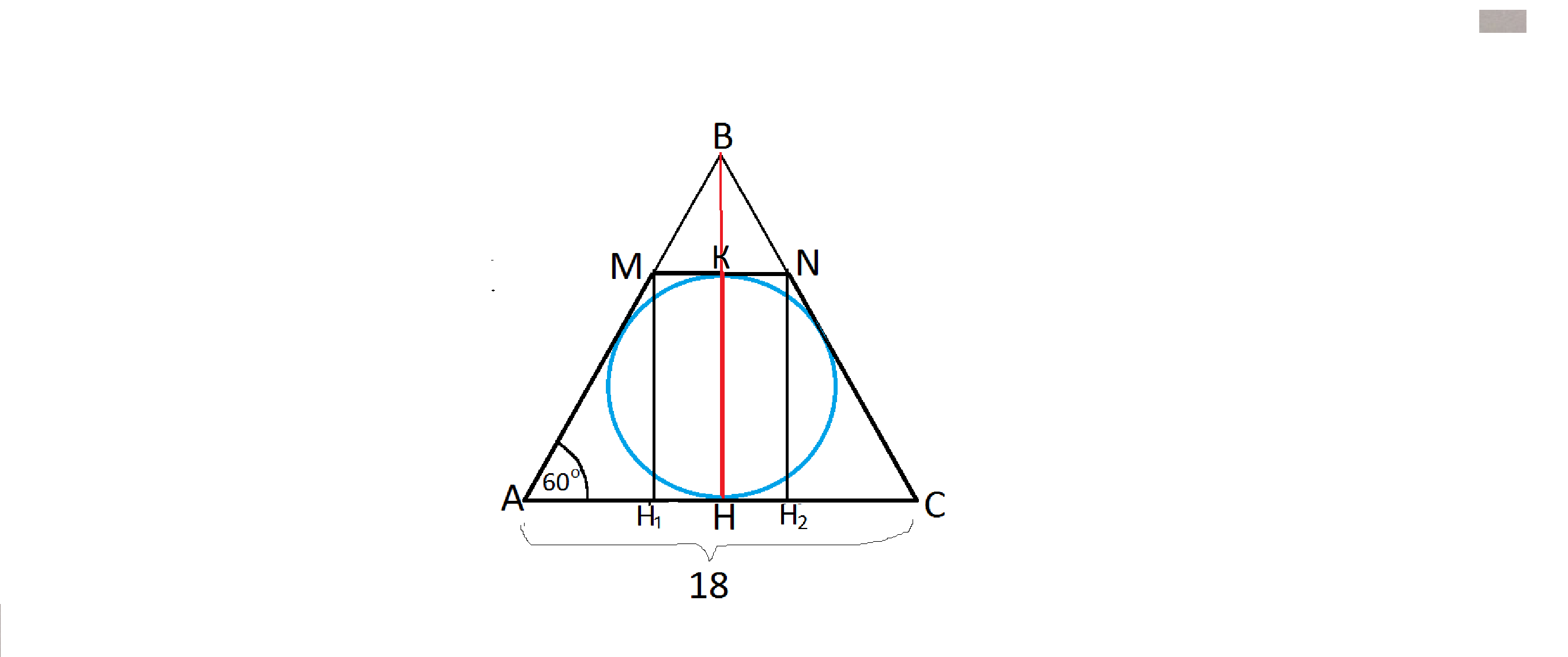 2. В равносторонний треугольник ABC вписана окружность и проведен отрезок MN, который касается ее и параллелен стороне AB. Определите периметр трапеции AMNB, если длина стороны AB = 18.