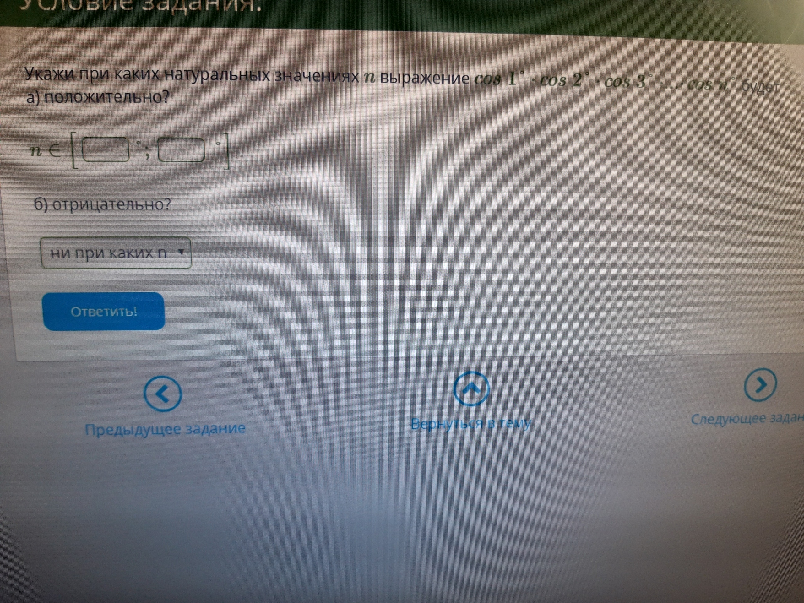 "не при каких тк опять же будет ноль или положительное значение." чему равен cos180, cos 150, cos135, cos120 ?