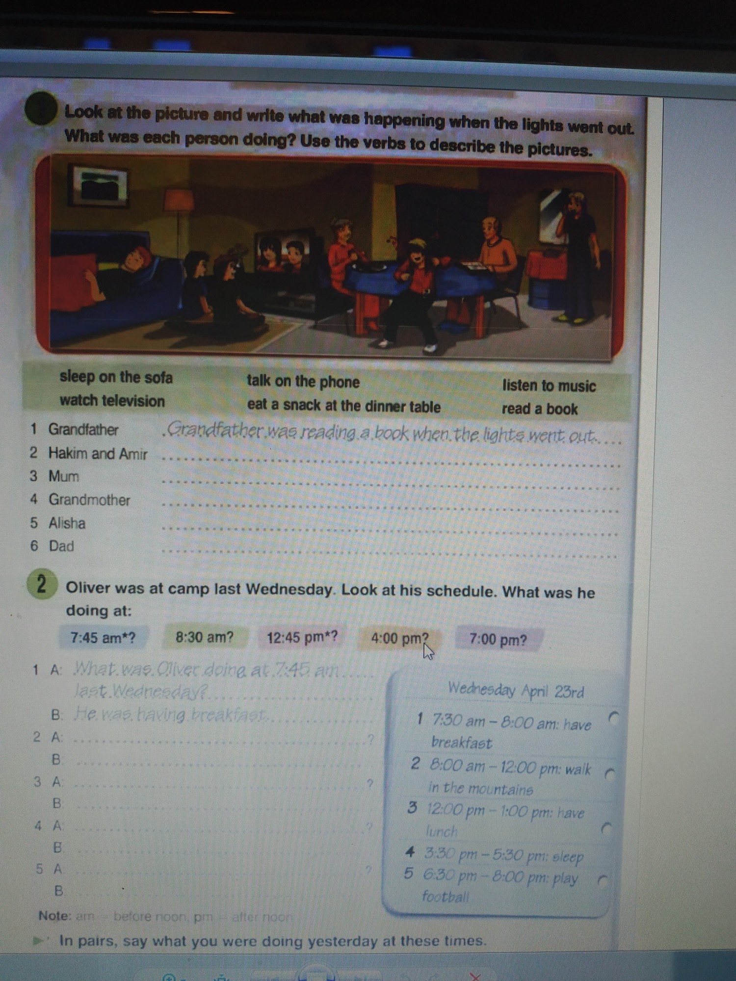 2)What was Oliver doing at 8:30 (half past eight) am last Wednesday?